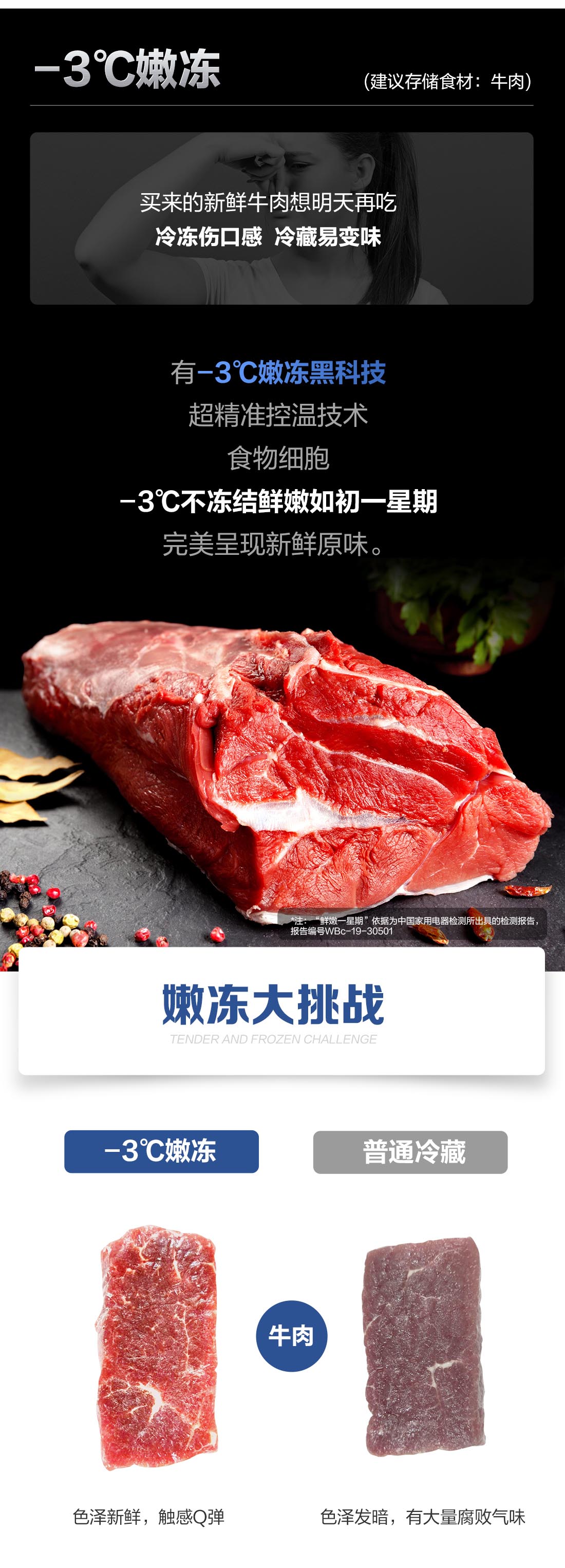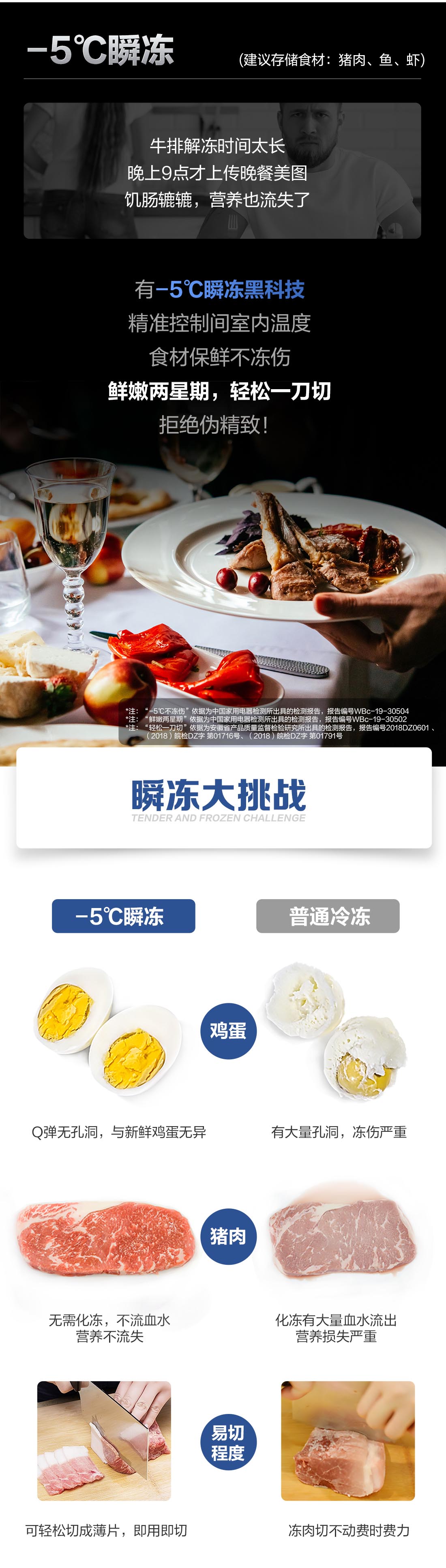 搭載-5℃瞬凍黑科技,鮮嫩兩星期,輕松一刀切。細(xì)胞級(jí)養(yǎng)鮮,營養(yǎng)流失少。搭載-3℃嫩凍黑科技,食材不結(jié)冰,鮮嫩一整周。智能全變頻技術(shù),恒溫保鮮,節(jié)能靜音。
